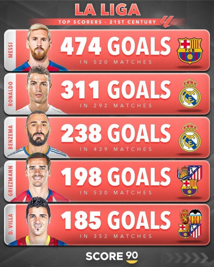 Danh sách này phản ánh cả một thế hệ huyền thoại, những người đã đưa La Liga lên đỉnh cao của bóng đá thế giới trong thế kỷ 21. Messi và Ronaldo tạo nên cuộc cạnh tranh chưa từng có, Benzema chứng minh giá trị bền bỉ, trong khi Griezmann và Villa khẳng định tên tuổi bằng sự ổn định và hiệu quả.